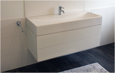 angepasster Hängeunterbau für Waschbecken, Sipphon ausgeschnitten, weiß, hochglanz mit zwei Schubladen | ![]() |